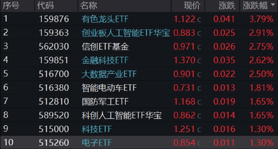 国产替代反扑,AI算力+应用展开反弹,全市场首只创业板人工智能ETF华宝(159363)场内收涨2.91%,日线3连阳。此外,大飞机推动军工替代再度活跃,国防军工ETF(512810)场内收涨1.65%。