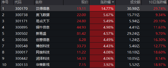 今日算力+应用携手反弹,创业板人工智能指数涨近3%斩获三连阳,成份股大面积飘红。AI算力方面,奥飞数据领涨5.67%,铜牛信息、新易盛、博创科技、网宿科技、润泽科技等多股涨超4%;AI应用方面,汉得信息大涨超14%,易点天下涨超5%。